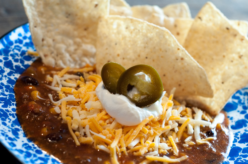 - Serve with tortilla chips, sour cream, jalapeño's and shredded cheese for garnish.