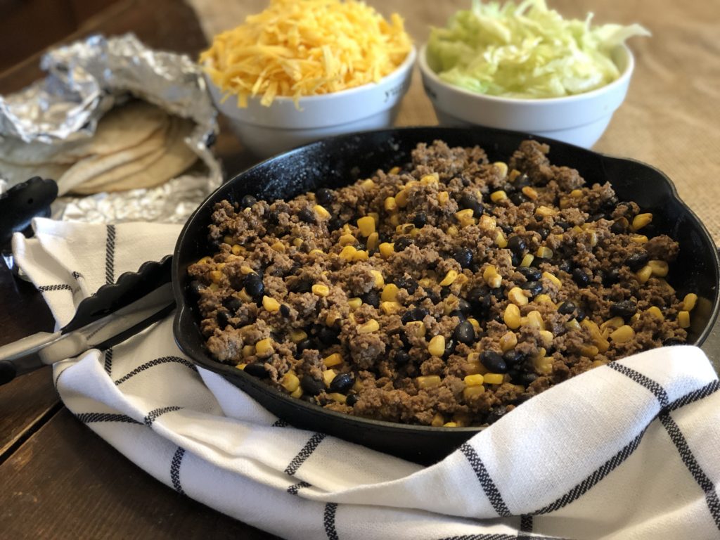 This is one of my favorite Taco Tuesday go-to’s. One skillet for the meat, veggie and beans