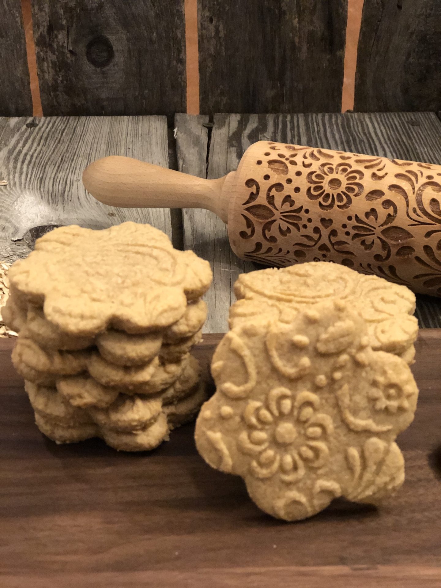 - Lightly dust the rolled-out dough with oat flour and roll again with an embossed rolling pin to create the design.