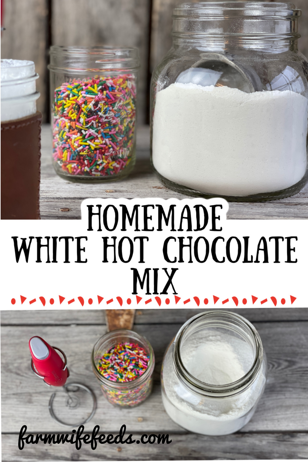 - When ready to make some combine 1/3 cup of mixture with 1 cup of boiling milk or water - top with whipped cream and sprinkles!