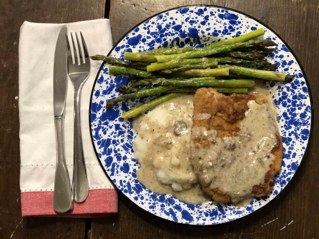 I don’t care what you call it, pork schnitzel or breaded fried pork tenderloin, it is delicious. This Pork Schnitzel with Dill Sauce I served with mashed potatoes and my Roasted Parmesan Asparagus, was perfect!